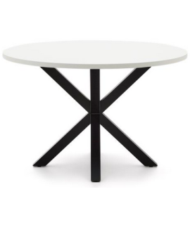 Mesa redonda fija con gran tablero blanco y patas cruzadas en metal pintado de negro. Es la mesa de diseño a elegir, si prefieres un estilo moderno y elegante en casa. Apto para todo tipo de muebles. En la foto de la ficha técnica todas las medidas.