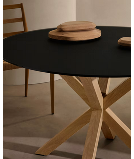 ZENIT Mesa Ø 120 o 150 cm tapa de cristal negro y base de metal color madera