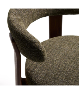 Preciosa y sólida taburete, de línea elegante y look renovado, inspirada en el género escandinavo de los años 70. Muy refinado, con una fuerte estructura en madera maciza con acabado nogal, destaca tanto por su estética como por su comodidad. Con asiento y respaldo acolchado revestido en tejido efecto chenilla color verde. Intrigante, con un diseño esencial y un carácter fuerte.