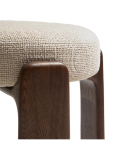 Preciosa y sólida taburete de línea elegante y look renovado, inspirada en el género escandinavo de los años 70. Muy refinado, con una fuerte estructura en madera maciza con acabado nogal, destaca tanto por su estética como por su comodidad. Con asiento acolchado revestido en tejido efecto chenilla color beige. Intrigante, con un diseño esencial y un carácter fuerte.