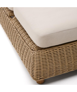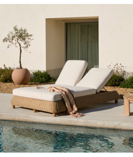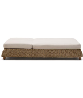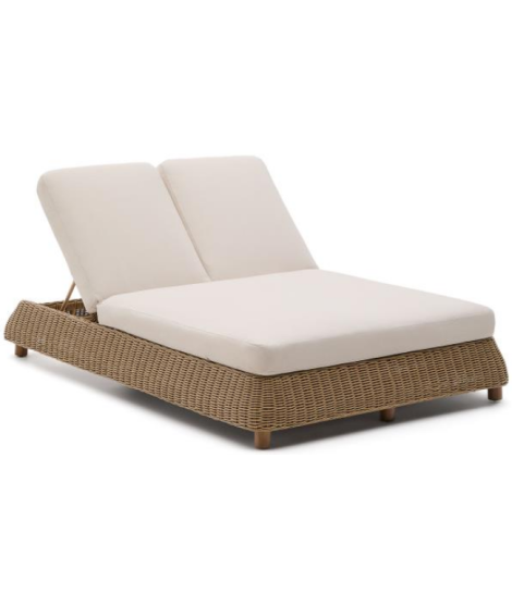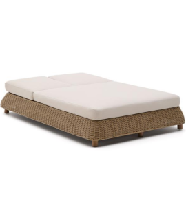 Estilo fascinante y elegante para esta tumbona doble con estructura de ratán sintético con acabado natural, resistente para uso exterior, con cojín en tejido repelente al agua, poroso de secado rápido, para garantizar un confort adicional. Desmontable y lavable. Pies en madera maciza de acacia. Cómodo y agradable. Ideal para combinar con otros accesorios de la misma línea, para amueblar con estilo tanto interiores como exteriores. También es adecuado para amueblar casas rurales, B&B y residencias con un estilo lujoso.