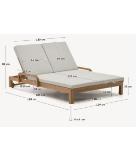 Maravillosa tumbona doble fabricada en madera maciza de eucalipto obtenida mediante un proceso ecológico, que implica una tala disciplinada y responsable de los árboles. Y además sometido a un tratamiento para asegurar un mejor acabado y mayor conservación. Con cómodas ruedas podrás moverla fácilmente y cojines incluidos, en tejido hidrófugo y desenfundables. Los muebles de esta línea dan un aspecto cálido y elegante a tus estancias. Un toque de refinamiento y elegancia para tu entorno. Todas las medidas estan en la foto de la ficha técnica.