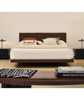 Cama doble refinada con base de 160x200 o 180x200 cm, chapada en nogal. Hermosa y elegante, con un trabajo artesanal meticuloso realizado por expertos artesanos. Fresado lineal de la madera y tira de luz LED en el cabecero.