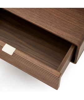 Cama doble con mesitas de noche integradas, disponible en las siguientes medidas: 296 x 210 cm (soporte de cama de 160 x 200 cm) o 316 x 210 cm (soporte de cama de 180 x 200 cm). Con estructura de chapa de nogal y acabado con barniz de poliuretano, es resistente al desgaste y a la humedad. El acabado estriado y la parte superior incorporan una tira de luz LED de 3000 K, una luz cálida ideal para un ambiente acogedor. Se maneja con el mando a distancia incluido. Incluye un cable de 1,5 m con enchufe directo. La madera cuenta con certificación de bosques gestionados. A continuación, se muestran los accesorios a juego de la misma línea. Todas las medidas se muestran en la foto de la ficha técnica.