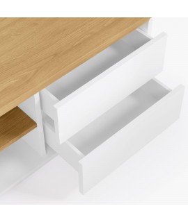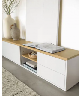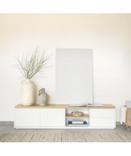 Beau meuble TV, très fini, laqué blanc qui donne beaucoup de lumière à l'environnement et étagères en placage de chêne. Genre épuré et incontournable, il s'adapte parfaitement à un environnement moderne, nordique ou vintage. Un meuble qui transmet élégance et tradition.