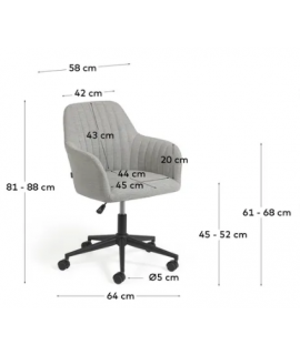 Cette chaise de bureau pivotante confortable a un design innovant. Fabriqué avec une structure en acier avec piston pour régler la hauteur d'assise, des roues confortables avec protection, également adaptées au parquet, un rembourrage confortable et une housse très pratique en tissu antitache et hydrofuge. Une chaise de bureau avec une ligne ergonomique qui garantit un confort maximum. Disponible en gris clair ou gris foncé. Sur la photo de la fiche technique il y a toutes les mesures.