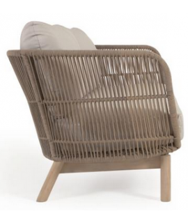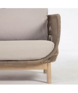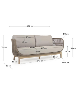 Canapé 3 places avec une structure en bois d'acacia massif traité à l'huile PNZ pour une longue durée de vie et une protection UV, revêtement en corde polyester résistant aux rayons UV et aux intempéries, coussins en tissu déperlant, entièrement déhoussables et lavables. Capacité maximale 320 Kg. Voir ci-dessous le fauteuil à combiner avec la même ligne. Sur la photo de la fiche technique, il y a toutes les mesures.