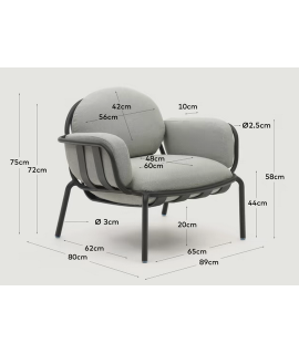 Fauteuil confortable et raffiné, adapté à l'extérieur ou à l'intérieur grâce à la praticité des matériaux avec lesquels il est fabriqué. Structure légère en aluminium, fabriquée dans des ateliers locaux, réduisant les émissions de CO2 pour un impact environnemental moindre. Rembourrage en polyuréthane avec siège soutenu et housse en tissu amovible et lavable en machine. Charge maximale 130 Kg. Vous trouverez ci-dessous tous les accessoires de la même ligne à assortir. Toutes les mesures sont sur la photo de la fiche technique.