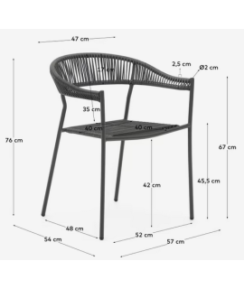 • Agréable chaise avec accoudoirs pour l'extérieur, moderne et design, sobre et fantaisiste. Le traitement particulier en corde de polyester sur une structure en acier galvanisé peint le rend beau et résistant, disponible dans les couleurs suivantes: gris, terre cuite ou vert. Sur la photo de la fiche technique toutes les mesures sont indiquées.