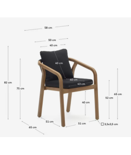 Une chaise confortable et très résistante avec accoudoirs, qui transmet une agréable sensation de confort et de bien-être à l'environnement, grâce aussi aux aventures naturelles du bois d'eucalyptus massif qui lui donnent une valeur supplémentaire, beau tressage de corde sur le dos du dossier et complet avec coussins . Convient pour l'extérieur et l'intérieur.
