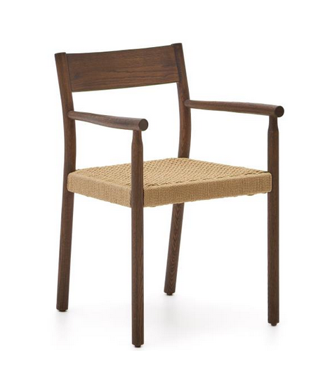 HELKE chaise avec accoudoirs en chêne massif finition noyer et assise en corde