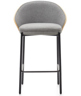 LEOPOLDO tabouret assise h 65 cm plaqué frêne finition naturelle en tissu gris clair et structure en métal noir