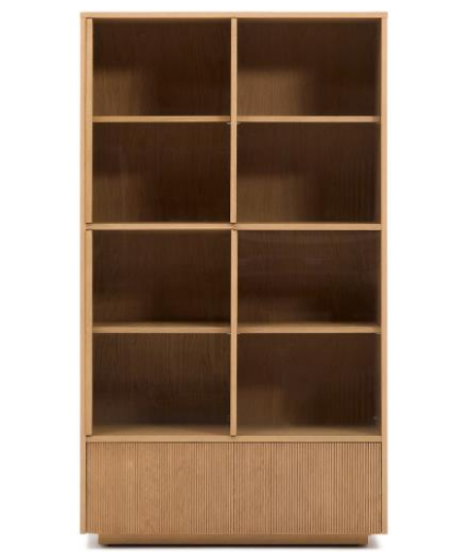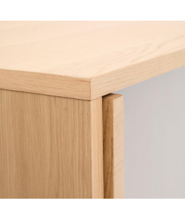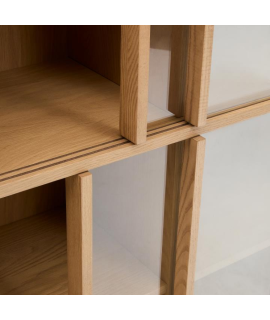 Ligne simple et élégante pour cette vitrine en placage de chêne et verre trempé. Elle est dotée de 4 portes coulissantes et de 2 tiroirs à ouverture par pression et de glissières invisibles. L'effet latté des lattes de bois disposées côte à côte fait de ce meuble une pièce unique, alliant simplicité et raffinement. Un magnifique accessoire de décoration qui apporte de la luminosité à votre intérieur.