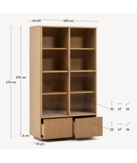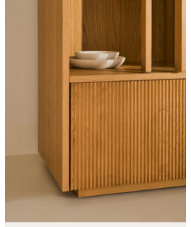 Vitrine raffinée, chaque pièce est un travail artisanal. Elle est composée de 4 portes coulissantes et de 2 tiroirs avec système d'ouverture et de fermeture amortie par pression, ainsi que d'étagères réglables pour ajuster l'espace de rangement. Structure en placage de chêne et verre trempé. Bois certifié, fabriqué à partir d'un mélange de matériaux issus de forêts certifiées et de bois contrôlé. Pieds réglables pour corriger les irrégularités du sol. Vous trouverez ci-dessous les accessoires assortis de la même gamme. Toutes les dimensions sont indiquées sur la photo de la fiche technique.