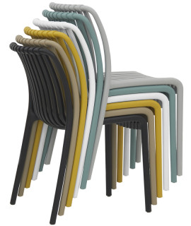 Chaise empilable pour la maison ou les bars, glaciers, cafés, restaurants, restaurants en bord de mer, hôtels et complexes balnéaires. Fabriquée avec une structure en polypropylène, elle est disponible dans une variété de couleurs. Ses lignes simples et épurées la rendent idéale pour une utilisation en extérieur, car elle est très résistante, pratique et facile à manipuler.