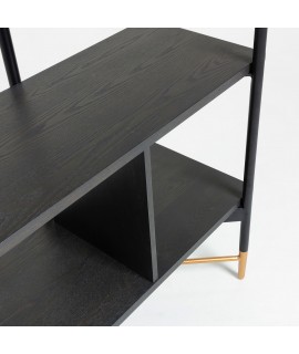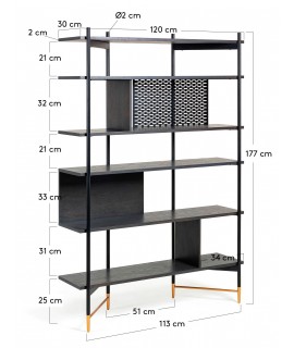 L'essentialité et la pureté du métal combinées au bois de frêne couleur frêne font de cette bibliothèque un grand meuble design. Avec structure en frêne plaqué finition frêne, pieds en métal noir et or et détail en maille métallique. Belle et délicieuse, elle offre un goût nouveau et élégant. Vous trouverez ci-dessous d'autres meubles de la même ligne assortis. Toutes les mesures sur la photo de la fiche technique en faisant défiler avec la flèche dans les photos.