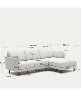 Le design du canapé est captivant, avec des pieds en hêtre noir massif et un pied central caché qui donne un excellent support au canapé. Canapé 3 places avec méridienne, que vous pouvez placer à droite ou à gauche, selon vos envies et la forme de la pièce. Grand confort et commodité de nettoyage, car tous les coussins du canapé sont déhoussables. Structure solide en bois massif, rembourrage en mousse de polyuréthane et housse anti-taches hydrofuge très pratique. Capacité maximale 400 Kg. Toutes les mesures sont sur la photo de la fiche technique.