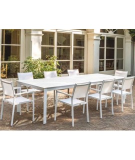 Une nouvelle ligne, qui apporte raffinement et prestige à votre environnement extérieur, confortable et résistant aux intempéries. Cette collection comprend une structure en aluminium peint: blanc ou anthracite et une assise et un dossier en textilène interchangeable, disponibles dans les couleurs suivantes: gris tourterelle, gris ou blanc. Tabouret haut qui a la caractéristique d'une grande résistance. Très fort, durable et résistant aux intempéries et aux rayons UV. Beau, élégant et design. Empilables.