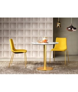 Disponible avec structure de pied tubulaire épaisseur 16 mm en acier effet or satiné. Existe en coloris : vert paon, jaune safran, vison ou gris. Cette chaise est vendue par lot de 2 ou multiples de 2, ex. : 2 - 4 - 6 - 8 etc.