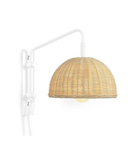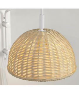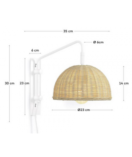 Magnifique appliqué en rotin naturel tressé à la main. Préparé pour lampe (non incluse) avec gros raccord E27 et type : basse consommation, led ou incandescent. Toutes les mesures sont sur la photo de la fiche technique.