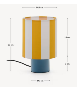 Lampe de table en métal bleu avec abat-jour rayé blanc et jaune. Pour une maison jeune et moderne, grâce à ses lignes épurées et son design, il est idéal pour meubler une chambre d'enfant avec une touche de bon goût et de charme. Vous trouverez ci-dessous l'accessoire support abat-jour.