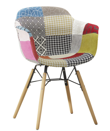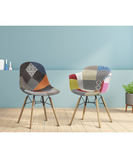 Chaise confortable avec accoudoirs avec pieds en bois de hêtre massif et notamment en métal peint noir, rembourrée et recouverte de patchwork. Un style agréable, avec un design attrayant, pour donner une touche différente et unique à votre environnement. Original et intrigant, il est confortable et accueillant.