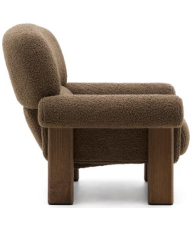 KRUZOF fauteuil en tissu bouclé marron et pieds en frêne massif finition noyer