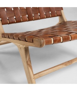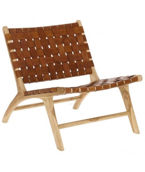 MARIKA Fauteuil vintage en bois massif et lanières de cuir marron