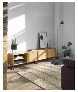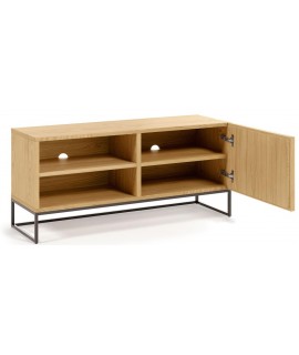 Meuble TV en bois de chêne naturel avec 1 porte et 2 compartiments ouverts, avec passe-câbles, une ligne design épurée et épurée. Pour une maison moderne, ethnique, nordique, vintage ou industrielle. Vous trouverez ci-dessous tous les accessoires de cette ligne. Sur la photo de la fiche technique toutes les mesures.