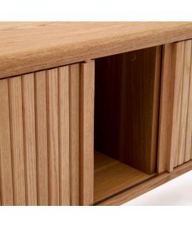 Meuble TV intrigant et particulier, savoureux et raffiné, audacieux et dynamique, qui met l'accent sur la praticité et le design élégant. Réalisé avec 2 portes coulissantes, en placage frêne finition naturelle avec bandes effet lattes. Ci-dessous vous trouverez les accessoires de la même ligne assortis. Toutes les mesures sont sur la photo de la fiche technique.