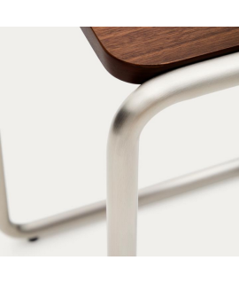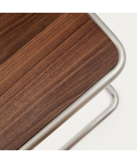 Superbe table basse avec plateau en placage de noyer, finition vernis polyuréthane pour une résistance à l'usure et à l'humidité. Son piètement en acier inoxydable brossé est équipé de pieds réglables pour s'adapter aux irrégularités du sol. Le bois est certifié issu de forêts gérées durablement. À assortir aux autres accessoires de la même collection. Toutes les dimensions sont indiquées dans la fiche technique en parcourant les photos.