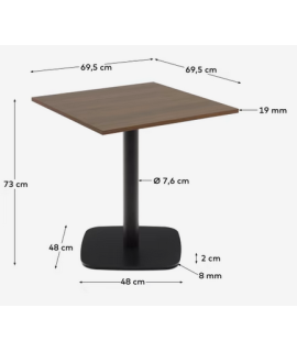 Une belle table élégante, pratique et résistante. Idéal pour les bars, restaurants, hôtels, réalisé avec une colonne ronde en acier peint en noir. Plateau carré en mélamine finition noyer.
