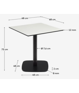 Une belle table élégante, pratique et résistante. Idéal pour les bars, restaurants, hôtels, en colonne ronde en acier enduit de poudre noire. Plateau carré en HPL blanc, un matériau très pratique, résistant aux taches, aux chocs et à l'abrasion, aux hautes températures, aux antibactériens et particulièrement adapté à une utilisation en extérieur.
