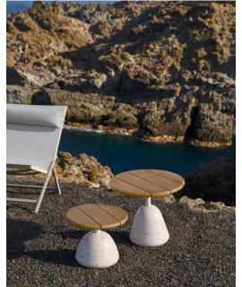 Table basse pratique et raffinée. Réalisé avec une colonne ronde en métal thermolaqué blanc et une base inférieure en béton terrazzo vénitien Ø 41. Plateau en bois d'acacia massif, finition naturelle, h 3 cm. Outre le design tendance, les matériaux utilisés sont très résistants aux agents extérieurs, aux intempéries et aux rayons UV. Convient pour l'extérieur ou l'intérieur. La table est équipée d'un pied en caoutchouc pour protéger le sol.