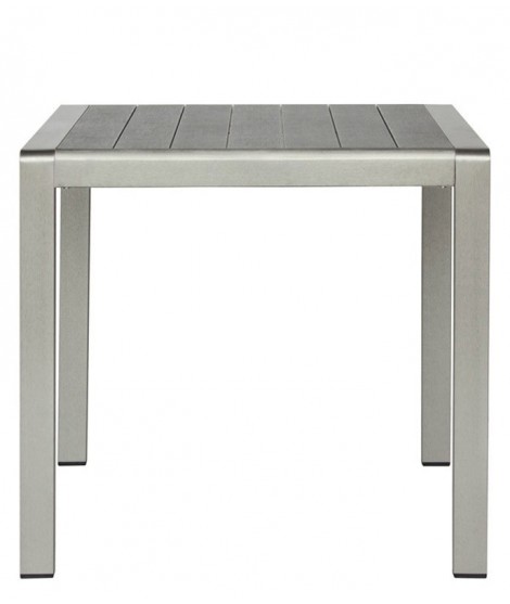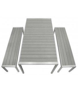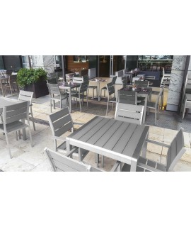 Table avec structure en aluminium satiné et plateau en matériau composite gris. Parfait pour les bars, cafés, résidences, restaurants, hôtels en bord de mer locales, chambres d'hôtes, établissements balnéaires. Idéal pour vos espaces extérieurs, les jardins ou terrasses. Simple et élégant. Sur ACCESSOIRES vous trouverez des chaises ou banc, dans la même ligne, à utiliser à cette table.