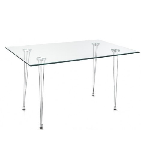 Table de bureau rectangulaire avec plateau en verre trempé transparent de 10 mm de haut et beaux pieds en métal chromé. C'est la table design à choisir, que ce soit chez vous ou dans votre studio ou bureau ou magasin, vous préférez un style moderne et élégant. Toutes les mesures sont indiquées sur la photo de la fiche technique.