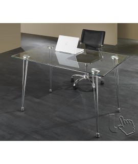 Table de bureau raffinée avec pieds en métal chromé avec une ligne particulière et plateau en verre trempé transparent. Distincte et agréable, elle favorise une immense lumière à votre environnement. Un style et un design modernes, adaptés à l'étude, au magasin, au bureau ou à la maison, au salon.