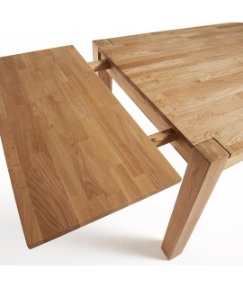 Essentiel, solide et moderne, en chêne naturel. Sur cette table, en plus de déguster de délicieux plats, vous apprécierez tout le naturel, l'essentialité et la préciosité du bois. A rencontrer avec plaisir. Extensible avec les rallonges latérales vous pourrez vous asseoir à table à plusieurs, pour festoyer, rire, discuter et faire la fête devant la table dressée. Beau et design.