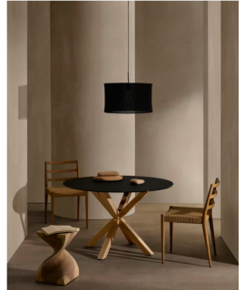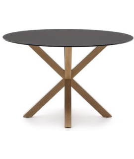Table harmonieuse, élégante et raffinée avec base croisée en acier couleur bois et plateau rond en verre noir avec revêtement très résistant aux coupures et aux taches. Une table vraiment accueillante, unique et intrigante, où le design et la stabilité la caractérisent. Un look attrayant et moderne.