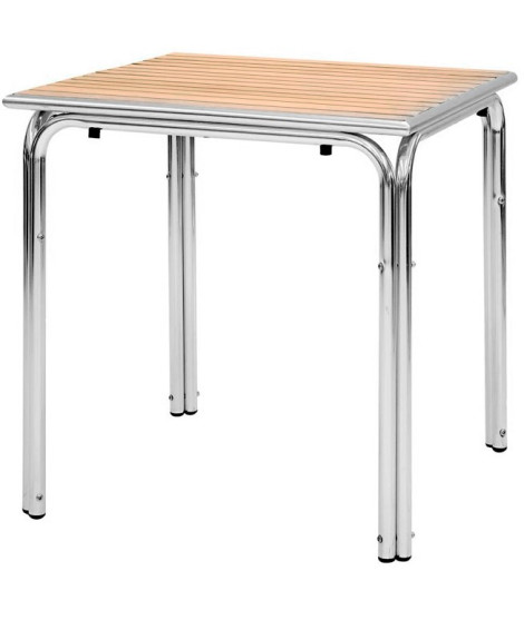 Table with anodized aluminum structure and square slatted oak top. Perfect for bars, cafes, residences, restaurants, waterfront venues, hotels, B&Bs, beach establishments. Ideal for your outdoor spaces, garden or terraces. Elegant and refined. Below you will find the chairs to match this line.