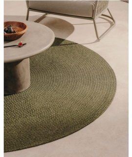 Carpet made of round green synthetic fibre. A beautiful circle in a play of bright and vibrant colours, to sprinkle good humor and dynamism into your environment. Made of synthetic fiber, it is very easy to clean and also suitable for outdoors. It brightens up and colors pleasantly wherever you want to place it.