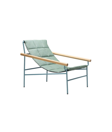 Comfortable armchair, deckchair with wooden natural oak armrests, made with a matt painted steel frame, choice of colour, very resistant to bad weather, and breathable and water-repellent fabric cover with quilted squares, choice of colour. Extremely practical for indoors or outdoors, you can take it out in the summer months to stay in the open air and enjoy your garden or terrace in the company of friends. A Mediterranean style, fresh and bold, which combines modernity with tradition. The design and great comfort ensure extreme versatility in placing it wherever you want.