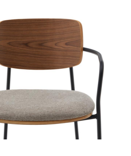 Stackable chair with armrests, with structure in walnut veneer and black metal. Essential but highly stable, this is the element that characterizes this chair with a simple and captivating design. Modern and functional, it is comfortable with a comfortable padded seat cushion covered in fabric. Its linearity and colors make it versatile and innovative.