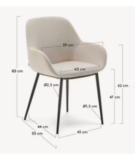 Charming chair with armrests, to enjoy your moment of relaxation and feel pampered. Nice upholstery, pleasant to the touch, in beige chenille effect fabric and solid base in black painted metal. Elegance and comfort at your fingertips. Maximum capacity 130 kg. In the photo of the data sheet there are all the measures.
