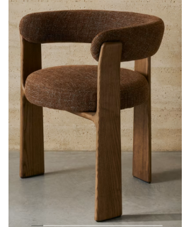 Beautiful and solid 3-legged chair, with armrests, with an elegant line and a renewed look, inspired by the Scandinavian genre of the 70s. Very refined, with a strong structure in solid ash wood with walnut finish, it stands out for both its aesthetics and comfort. With padded seat and backrest covered in brown chenille effect fabric. Intriguing, with an essential design and a strong character.
