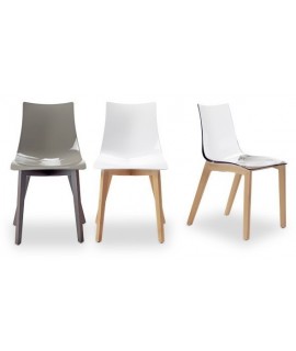 Chair with simple but at the same time intriguing shapes. Essential and elegant, wonderful chair with very resistant polycarbonate shell in white or full dove gray colors, which contrasts perfectly with the beautiful structure in natural beech or bleached beech or wenge.