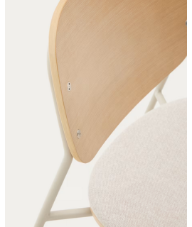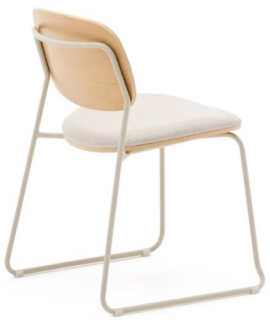 Beautiful and comfortable chair with a sled design, intriguing and elegant. The essential line and maximum comfort of the seat make it perfect for both the kitchen and the living room. Beige metal frame with poplar plywood backrest and poplar plywood seat with cushion covered in chenille, certified fabric for environmentally safe and responsible production. Protections on the legs to avoid scratching the floor.