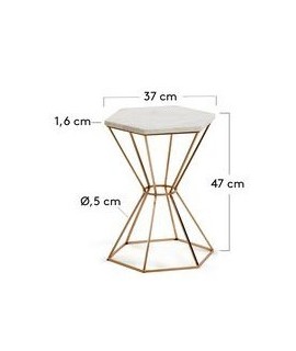 Il design di questo tavolino mette in evidenza due caratteristiche principali: i materiali utilizzati, il metallo color rame con la quale è strutturata la base in combinazione con il prestigioso piano in marmo, e le forme geometriche, una perfetta sincronia di linee che formano un meraviglioso esagono.