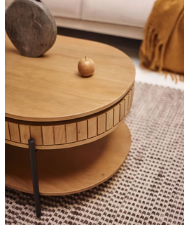 Captivating line for this oval coffee table with comfortable elegant and prestigious drawer. In solid mango wood, with a base made up of juxtaposed strips, which make this table a unique piece, which exudes essentiality and refinement. A wonderful piece of furniture, which transmits brightness to the environment.