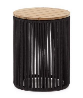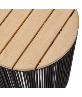 KINDY coffee table ⌀ 40 cm with steel structure and black or beige rope and solid acacia wood top